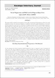 The present study was aimed the determination of serum PAG concentrations during pregnancy and the first month postpartum in Karya ewes and the investigation of correlations between the serum concentrations of the steroid hormone progesterone, upon which the continuation of pregnancy depends, and PAG levels throughout pregnancy. Blood samples were collected from each of the ewes at weeks 1, 2, 3, 4, 5, 6, 7, 8, 9, 11, 13, 15, 17, 18, 19, 20, and 21 after the day of mating (day 0), at the time of parturition, and at weeks 1, 2, 3 and 4 postpartum. PAG level and progesterone level during pregnancy and serum PAG level in the first postpartum month were determined. Plasma progesterone concentrations were lowest on the day of mating, but progressively increased as of week 9 of pregnancy and peaked at gestational week 18. Progesterone levels were observed to decrease after week 18. The mean PAG concentrations of the pregnant animals were observed to be at the basal level until the second week of pregnancy, but increased as of week 3 and peaked at week 19. PAG concentrations displayed a dramatic decrease during the first 4 weeks postpartum. Based on this finding, in the Karya ewes, the increase in the progesterone levels at gestational weeks 8 and 11 were associated with an increase in the PAG levels. Differences in the results reported for the correlation between PAG and progesterone levels could be due to less frequent sampling, species-specific differences in placental function and PAG cross-reactivity, as well as species- or subspecies-specific differences in PAG and progesterone dynamics during pregnancy. Var olan çalışmanın amacı Karya koyunlarında gebelik süresince PAG düzeyi ve progesteron seviyesi ile postpartum ilk aydaki serum PAG düzeyini belirleyerek progesteron ile PAG arasındaki korelasyonların gebelik süresince saptanması amaçlandı. Tüm koyunlardan, koçların aşım yaptığı günden sonraki 1, 2, 3, 4, 5, 6, 7, 8, 9, 11, 13, 15, 17, 18, 19, 20, 21’inci haftalar ile doğum sonrası 1, 2, 3 ve 4’üncü haftalarda kan örnekleri toplandı ve gebelik süresince PAG düzeyi ve progesteron seviyesi ile postpartum ilk aydaki serum PAG düzeyi belirlendi. Plazma progesteron konsantrasyonu gebeliğin 9. haftasından itibaren artış göstermiş olup, 18. haftada pik düzeye ulaşdı ve 18. haftadan sonra progesteron düzeylerinde düşüş gözlendi. Gebe hayvanlarda ortalama PAG konsantrasyonları ise gebeliğin ikinci haftasına kadar bazal düzeyde iken gebeliğin 3. haftasından itibaren yükselmeye başladı, gebeliğin 19. haftasında pik yaparak gebelik sonuna kadar da artış gösterdi. Doğumdan sonraki ilk 4 hafta süresince ise PAG konsantrasyonu dramatik bir şekilde bir düşüş gösterdi. Karya koyunlarında gebeliğin 8. ve 11. haftalarında progesteron seviyesi arttıkça PAG düzeyi de artış gösterdi. Bu bulgulara göre PAG ve progesteron arasında bildirilen korelasyonlardaki farklılıklar, daha az sıklıkta örnekleme yapılmasına, plasental fonksiyondaki türe özgü farklılıklara veya PAG çapraz reaktivitesindeki farklılıklara ve gebelik sırasında PAG ve progesteron dinamiklerindeki tür veya alt tür farklılıklarından kaynaklanıyor olabilir.